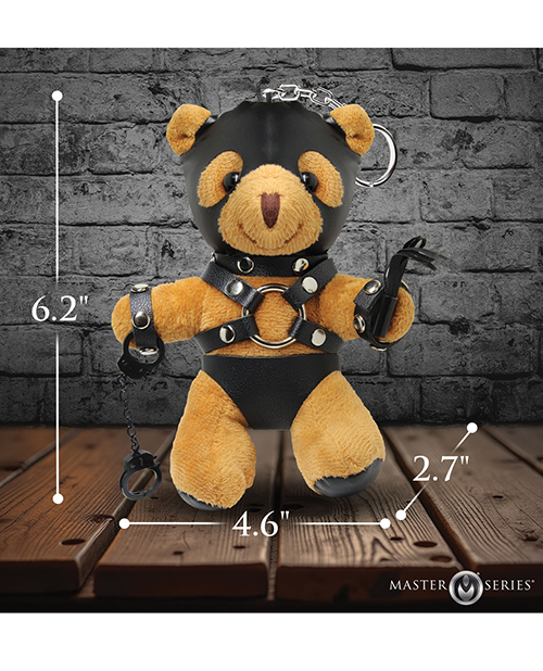 This charming plush bear has tan fur and is dressed in full bondage gear including a gimp-hood, harness, and underwear, complete with handcuffs and a flogger.