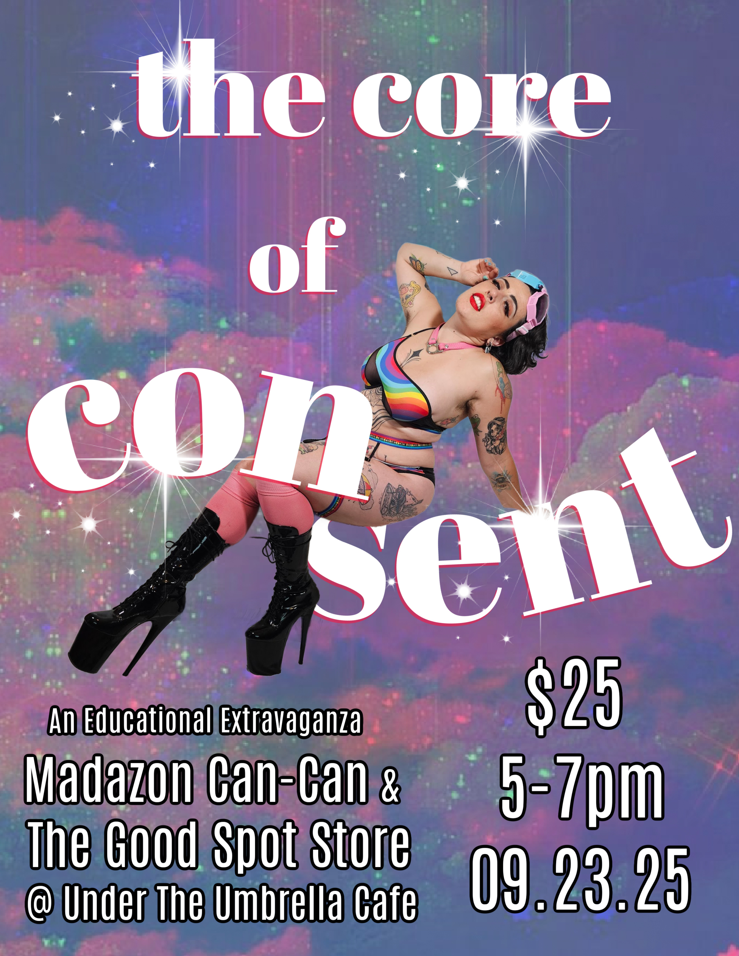 Join The Good Spot Store for “The Core of Consent,” an essential class designed to deepen your understanding and practice of consent in all aspects of your life. Led by the dynamic and insightful Madazon Can-Can, this workshop goes beyond basic definitions to explore the nuances of enthusiastic, ongoing, and informed consent.
